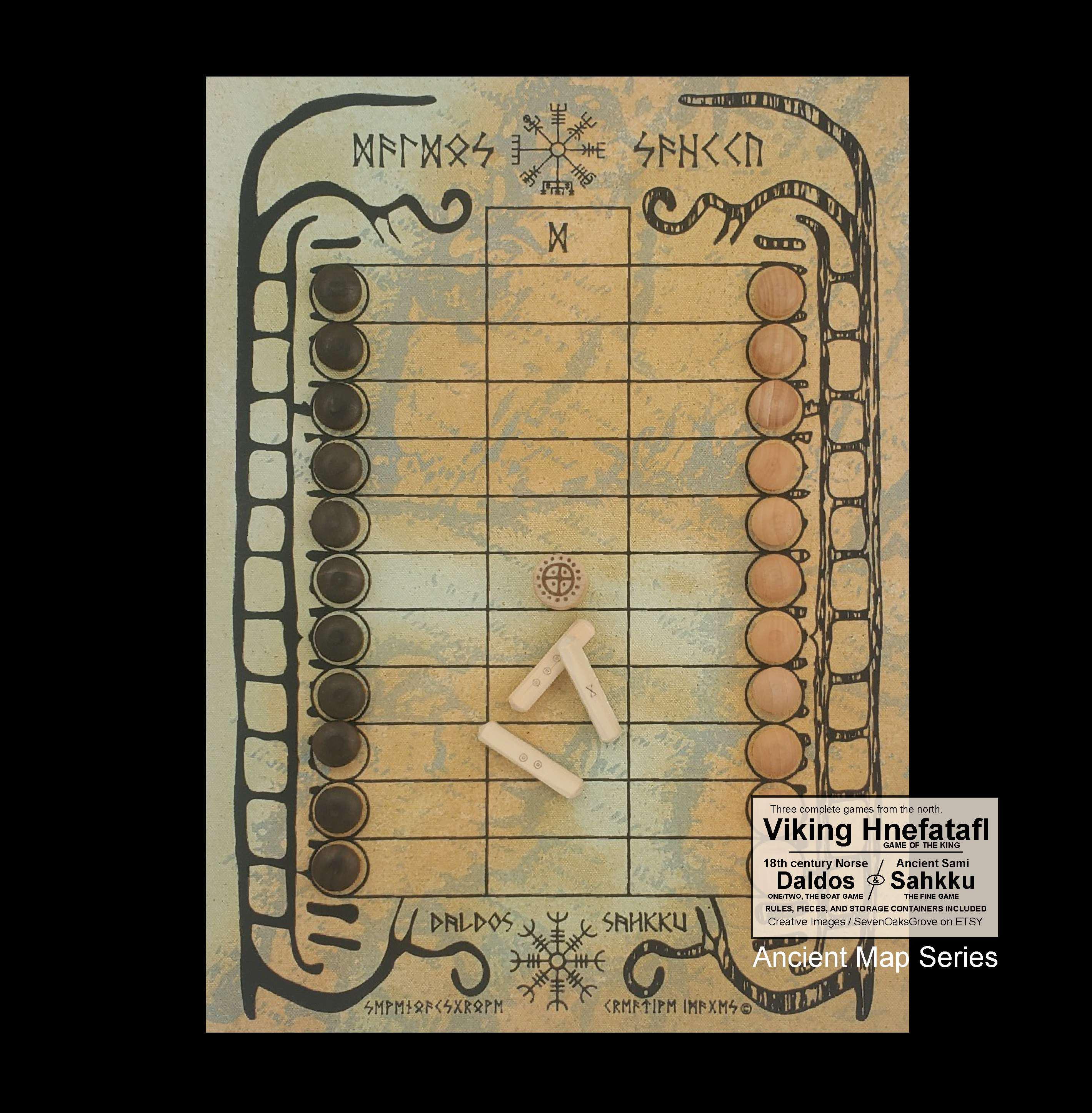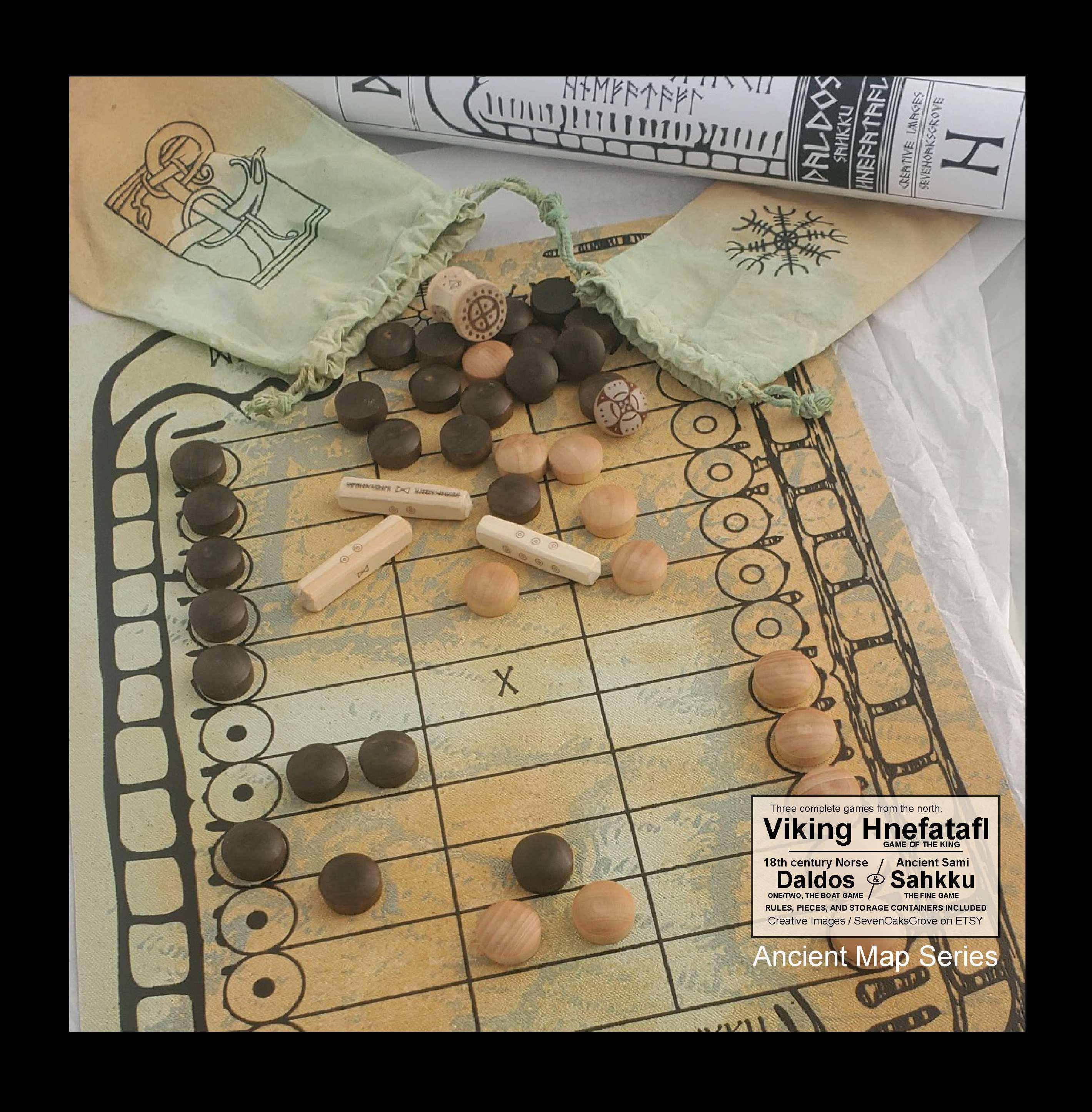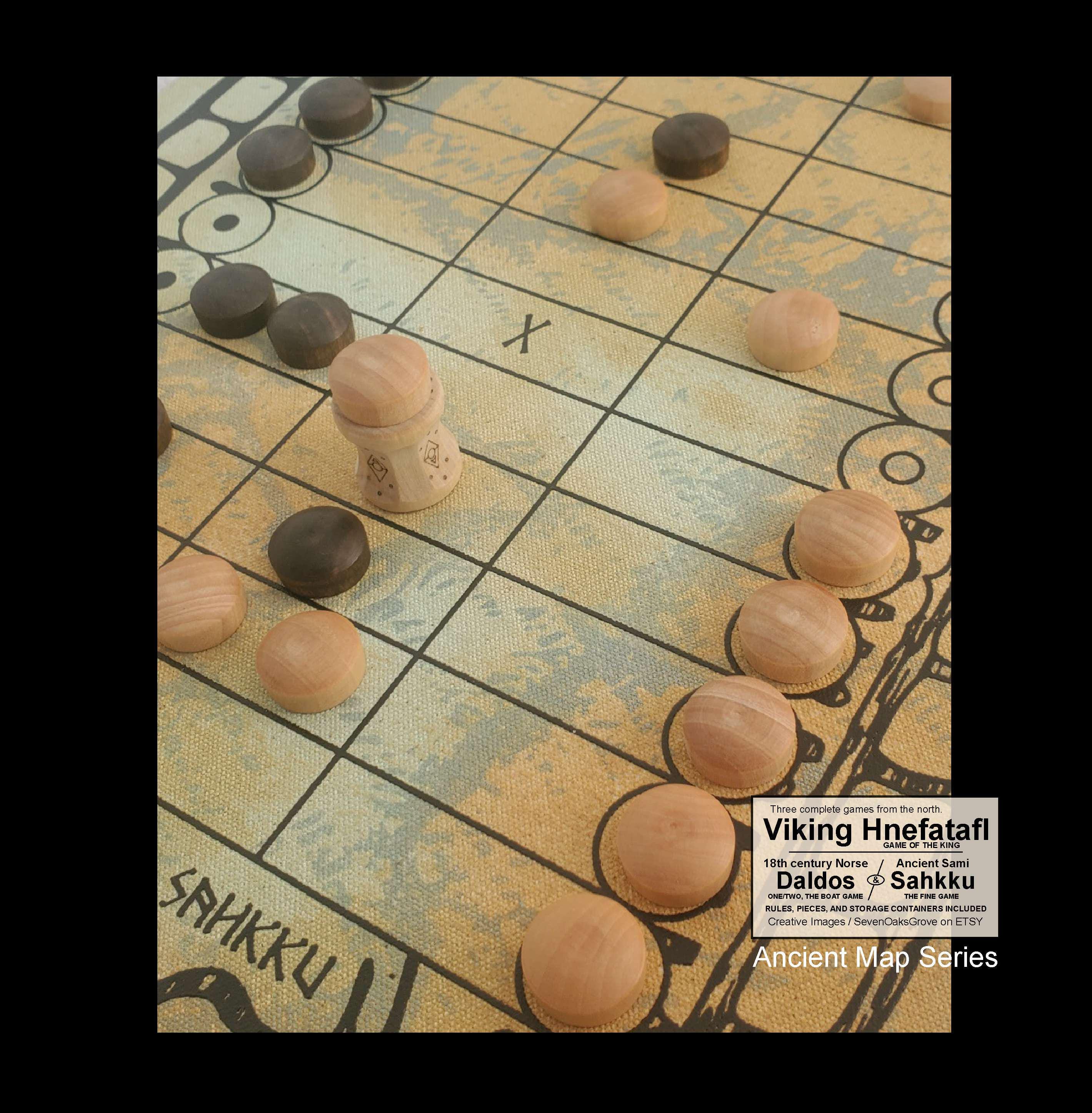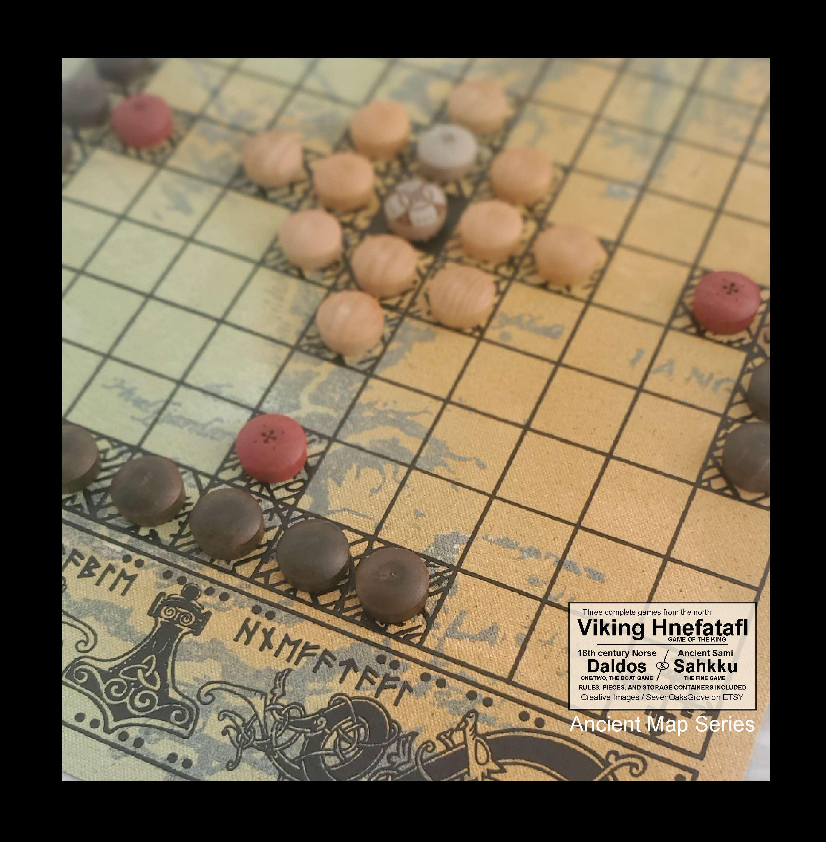 This two-sided board game set has Hnefatafl (more commonly known as Tafl, or Viking chess) on one side, and on the other side is a combination board used to play two different run-and-capture games, the Viking Daldos, and the Sami Sahkku. This set has the game mat looking like an ancient medieval map. The board is hand printed and made from hand colored and sealed duck cloth fabric, so no two are the same (the photo shows some typical stain coloring) all close but each unique. The images on the boards are hand printed and are given a slightly distressed look. The set comes with all the pieces to play these three unique, and historic games, rules, and storage.